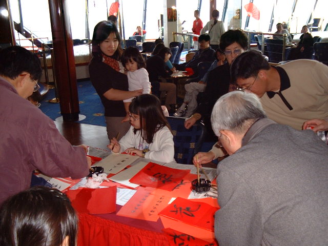 中国でも正月はやはり書初め。お爺ちゃん、字がうまい。見とれている。