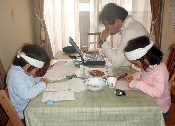 誰の入れ知恵か知りませんが、鉢巻を締めて勉強をする二人。