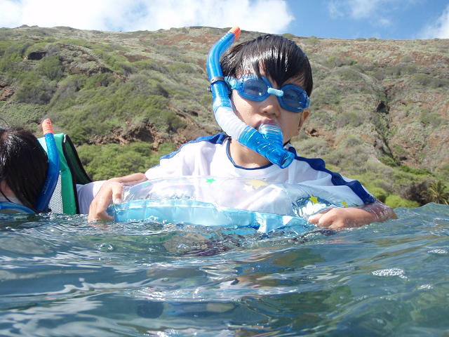 大人用のシュノーケルが一寸きついが、「魚が居るよ」と教えてあげると顔を水中に