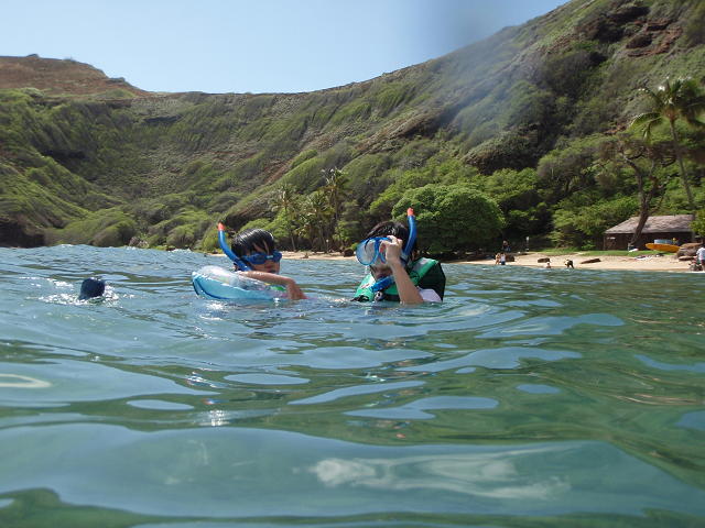我が家はシュノーケルとマスクでパチャパチャ泳いでいく。