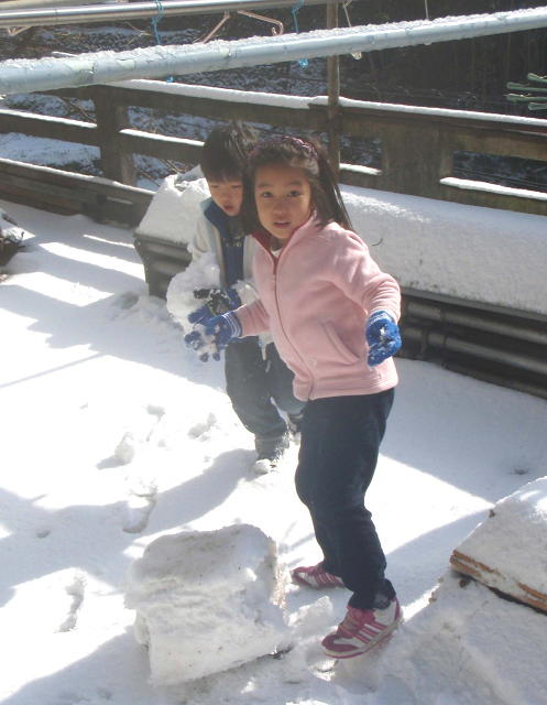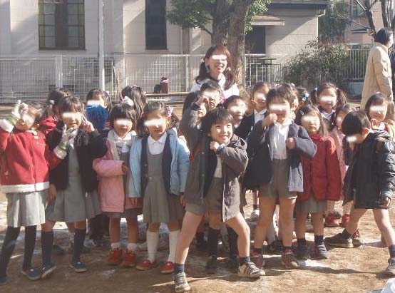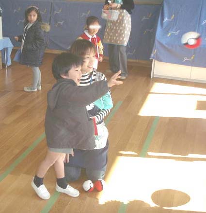 嶺の大好きな、先日結婚したばかりのT先生を囲む園児達。嶺のポーズは最近お気に入りのお猿の