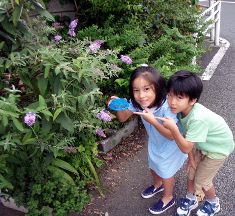 麓の牧場では昆虫・とかげ採集と、子供達は大はしゃぎである。
