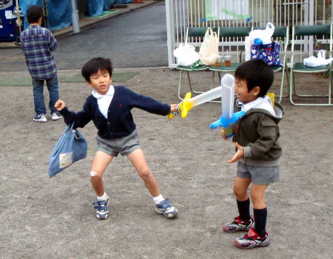 幼稚園のバザー会場で友達と決闘する嶺。二人が手に持つ剣は風船の様に空気が